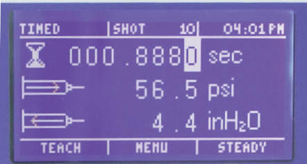 • 时间的增加幅度可以低至 0.0001 秒,提供精确的点胶控制。